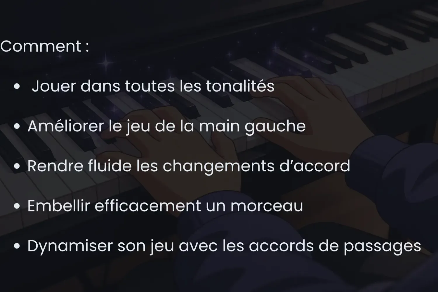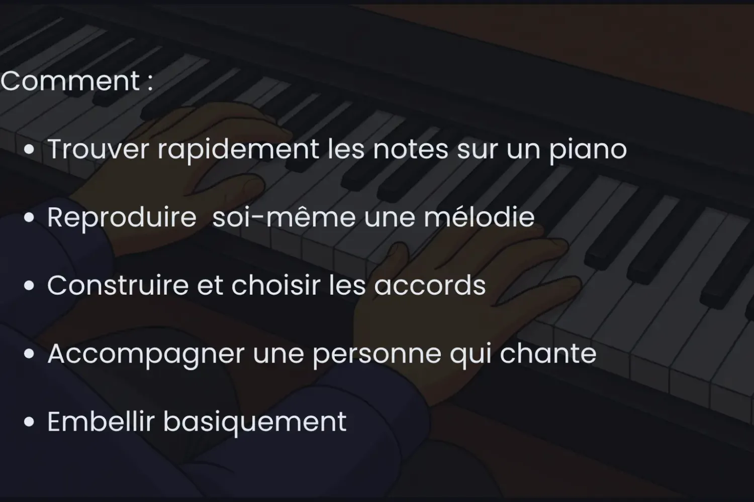 C'est un accompagnement complet et flexible conçu pour te rendre autonome et fluide au piano.
